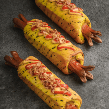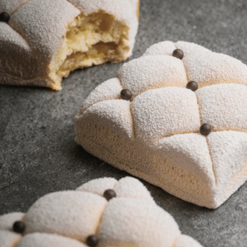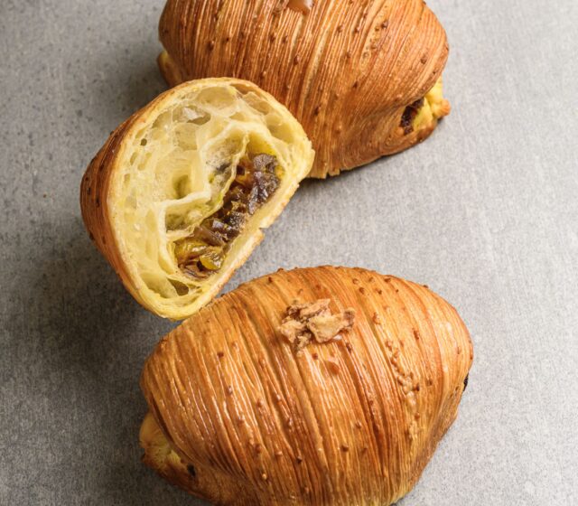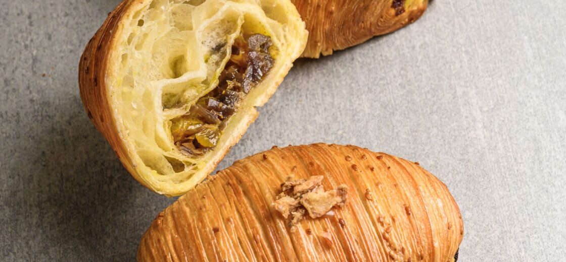 Façonnage : dresser l’appareil oignons sur le haut et le bas du pâton ainsi qu’une fine bande de feta, faire un façonnage de pain au chocolat type lunette, mettre en moule carré de 9 cm.